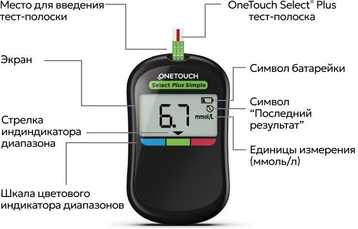 Глюкометр Ван Тач Селект Плюс Симпл отличается от глюкометра Ван Тач Селект Плюс Флекс. В комплект Ван Тач Селект Плюс Симпл не входит ручка для прокалывания и ланцеты, а так же в приборе отсутствует технология Bluetooth. В приборе Селект Плюс Симпл нет ничего лишнего - просто вставьте тест-полоску Ван Тач Селект Плюс в глюкометр и прибор включается автоматически. Селект Плюс Симпл без кнопок, без кодирования и не требует настроек. Максимально простая процедура измерения.