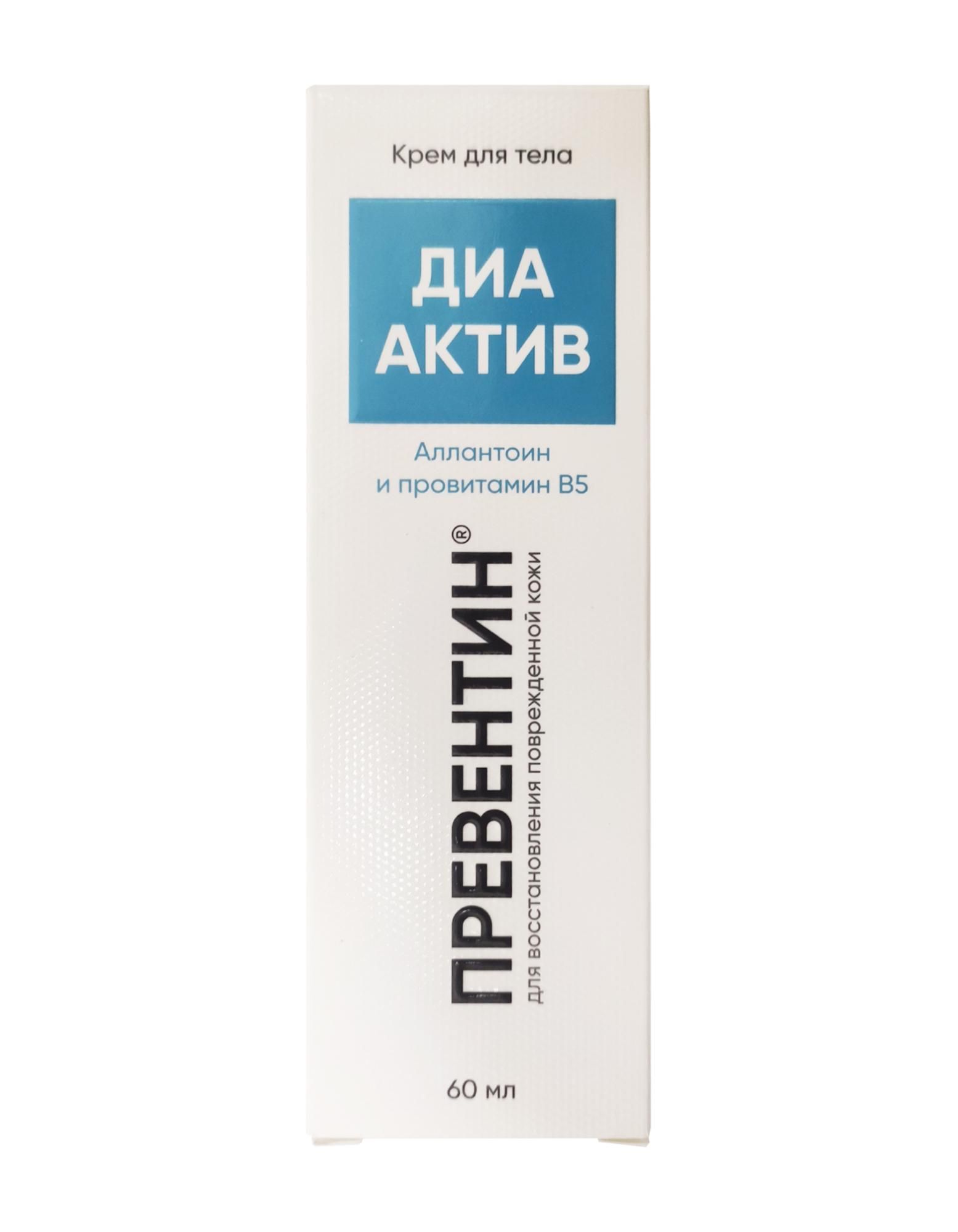 Специальный регенерирующий комплекс содержит экстракт облепихи, аллантоин, комплекс витаминов А и Е, экстракты алоэ вера, баданы и мяты. Такой состав направлен на активное восстановление кожных покровов, тонизирование и успокоение тканей и обладает антисептическим и противовоспалительным действием. Крем Превентин для тела помогает быстро устранить все микроповреждения кожи. В 2025 году производитель изменил упаковку, сделав ее более удобной и разместив все под одним брендом своей продукции - ДиаАктив.